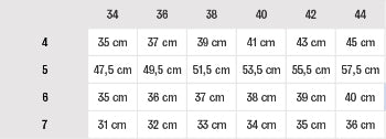 Um die richtige Größe für dich zu wählen, empfehlen wir einen direkten Vergleich mit einem gutsitzenden Teil von dir und den tabellarisch aufgelisteten Größenangaben.