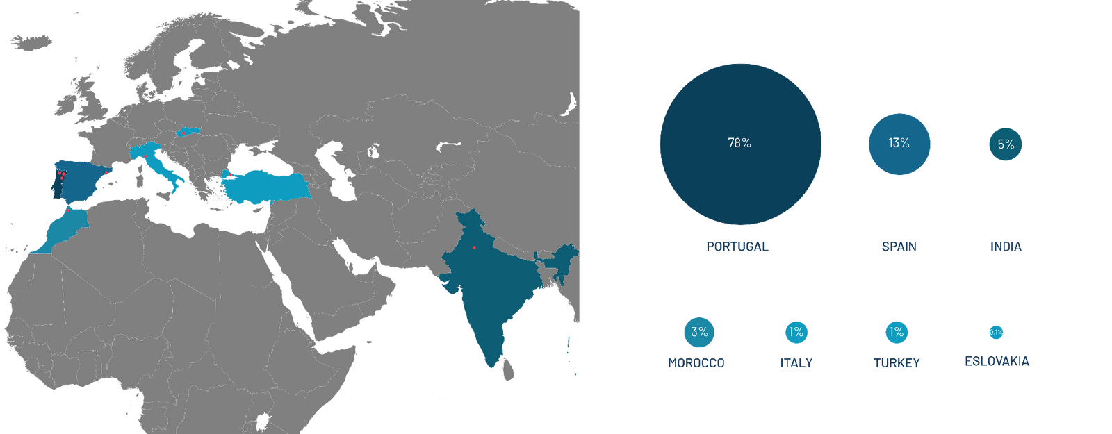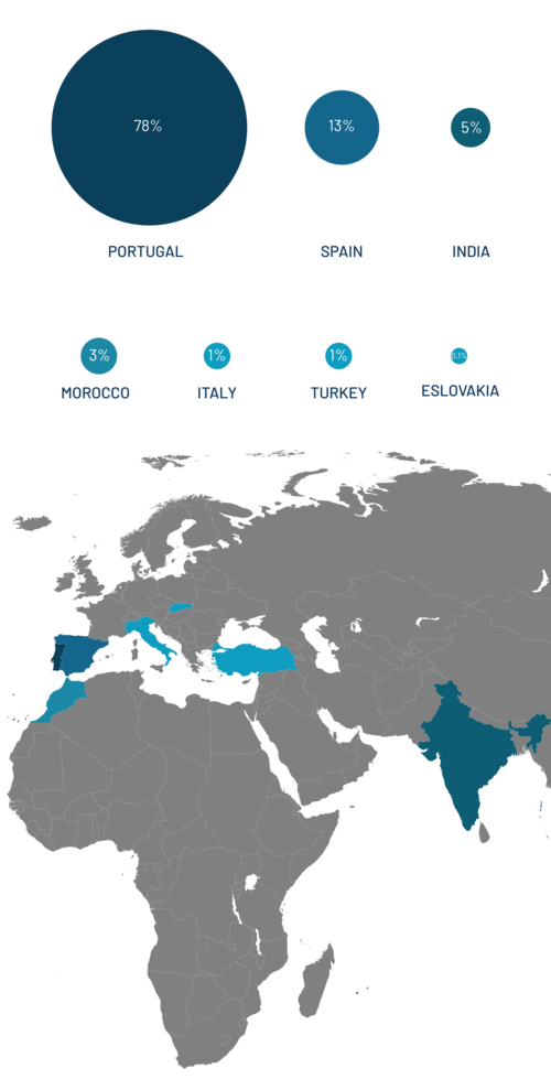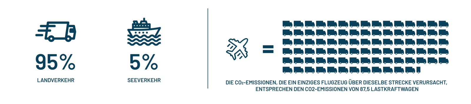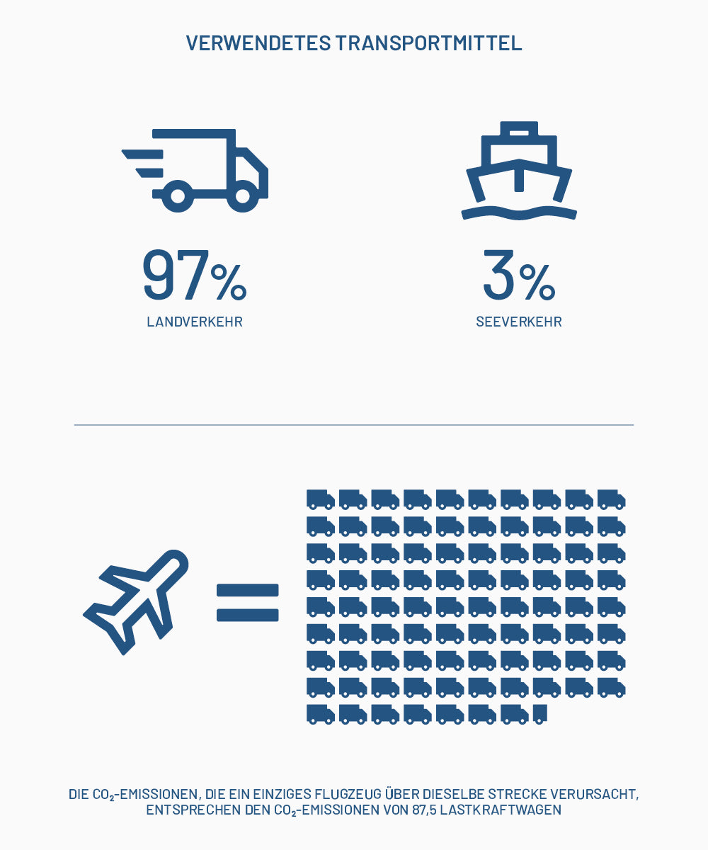 Für den Transport unserer Waren bevorzugen wir die ausschließliche Nutzung des Land- und Seeverkehrs und verzichten vollständig auf die umweltschädlichste Option: den Lufttransport. Auf den meisten unserer Strecken verlassen wir uns auf die Effizienz des Straßentransports, während wir uns auf den übrigen Strecken für den Seetransport entscheiden. Da die meisten unserer Fabriken und Zulieferer in der Nähe liegen, sind die Entfernungen, die mit diesen Mitteln zurückgelegt werden, relativ kurz.