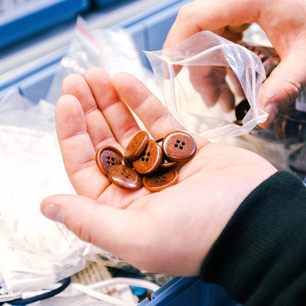 Bei unseren Kurzwaren und Verzierungen verwenden wir nachhaltige Alternativen, wie z. B. Knöpfe, die vollständig aus Corozo hergestellt werden, einer natürlicheren und biologisch abbaubaren Alternative.
