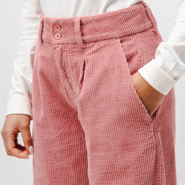 Features a carrot fit, front clasps, two side and back pockets, and a zipper and button closure.